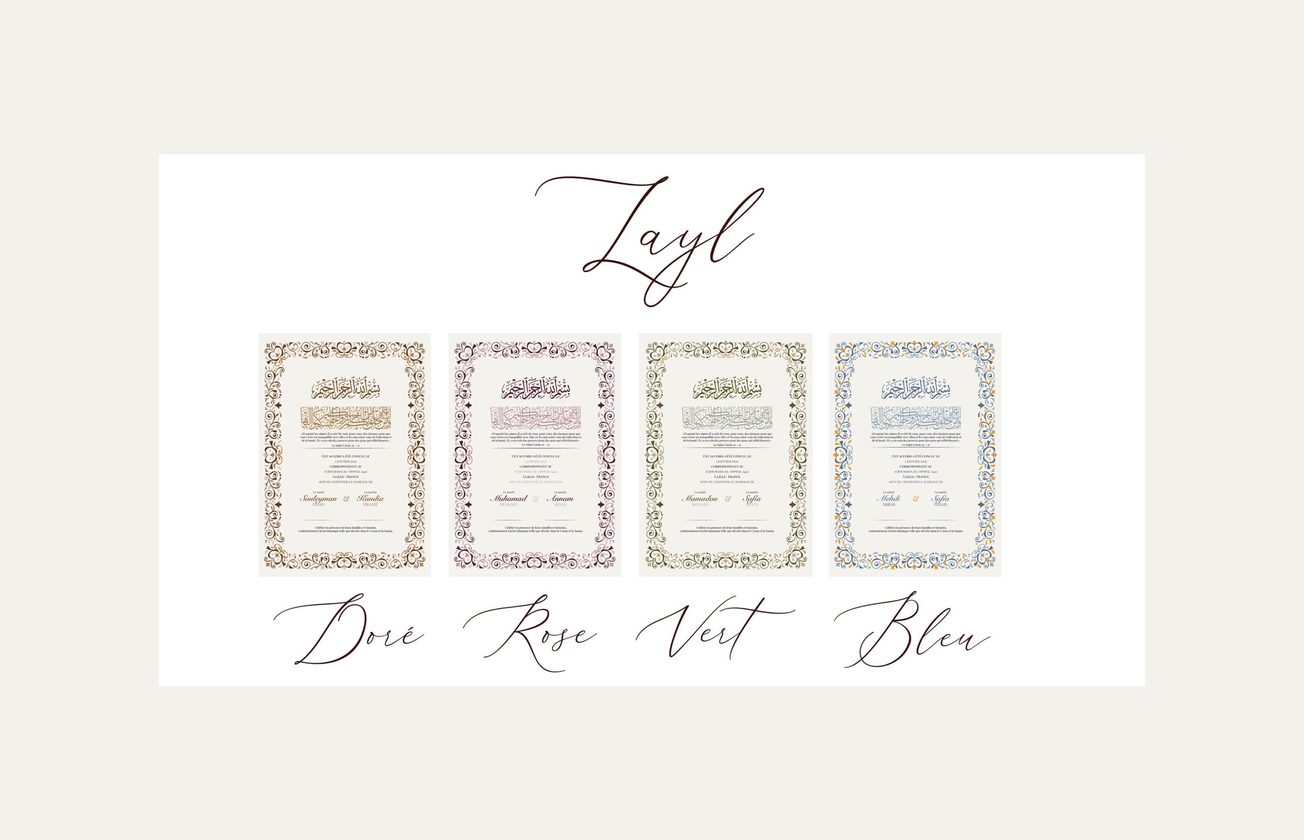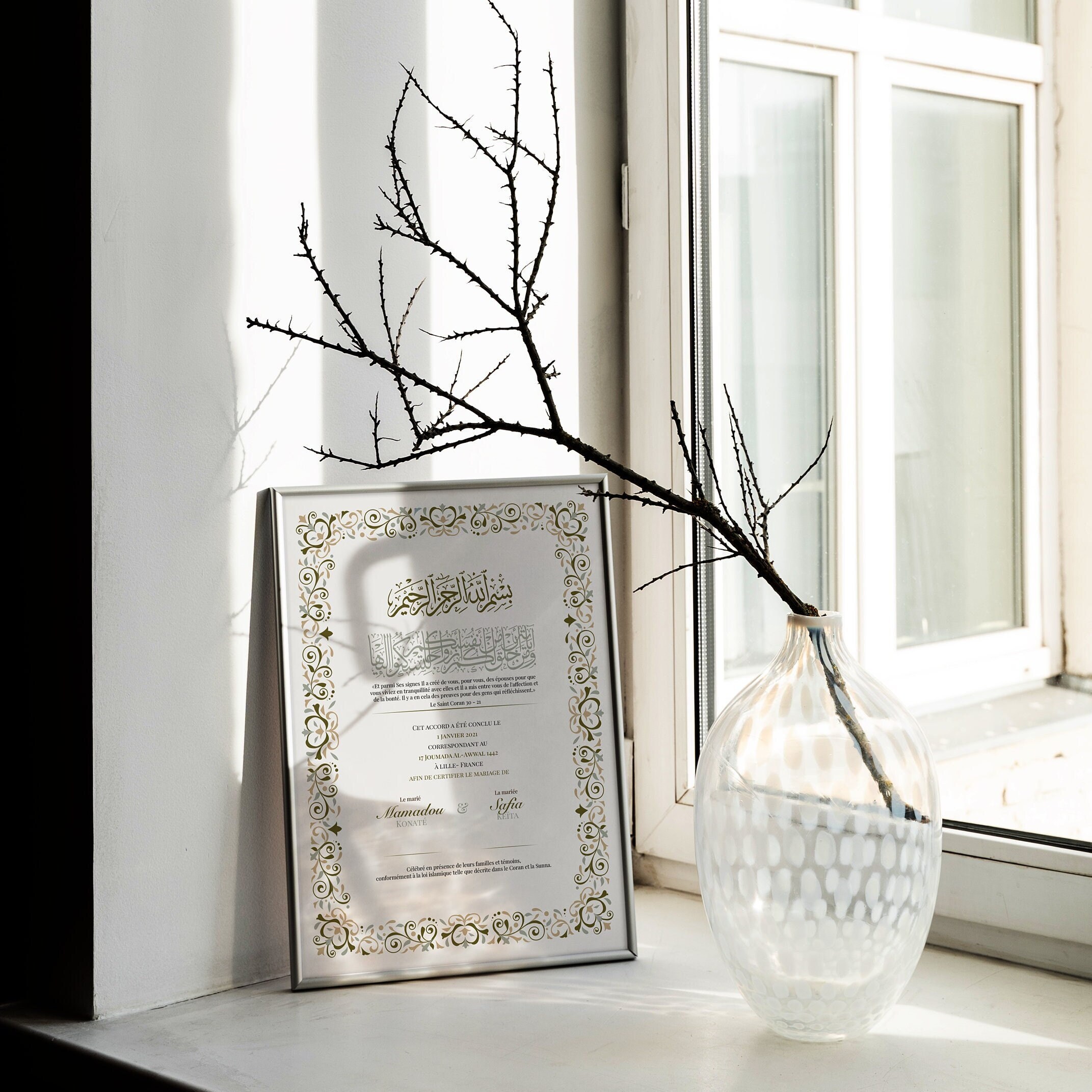 Il est essentiel de comprendre que ce Certificat de Nikkah est purement esthétique et n’a aucune valeur légale ou religieuse pour valider votre mariage. Il est destiné à être une œuvre d’art qui évoque la beauté de votre union et ne peut en aucun cas se substituer aux éléments officiels requis pour votre mariage religieux. Nous tenons à souligner que l’acquisition de ce certificat est totalement facultative. Il s’agit d’un choix personnel, une option supplémentaire pour ceux qui souhaitent créer un souvenir élégant et touchant de leur mariage religieux.