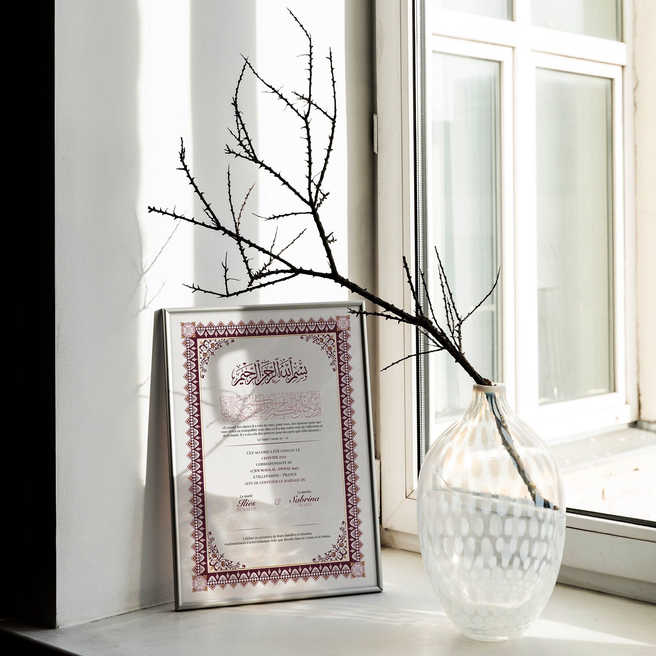Il est essentiel de comprendre que ce Certificat de Nikkah est purement esthétique et n’a aucune valeur légale ou religieuse pour valider votre mariage. Il est destiné à être une œuvre d’art qui évoque la beauté de votre union et ne peut en aucun cas se substituer aux éléments officiels requis pour votre mariage religieux. Nous tenons à souligner que l’acquisition de ce certificat est totalement facultative. Il s’agit d’un choix personnel, une option supplémentaire pour ceux qui souhaitent créer un souvenir élégant et touchant de leur mariage religieux.